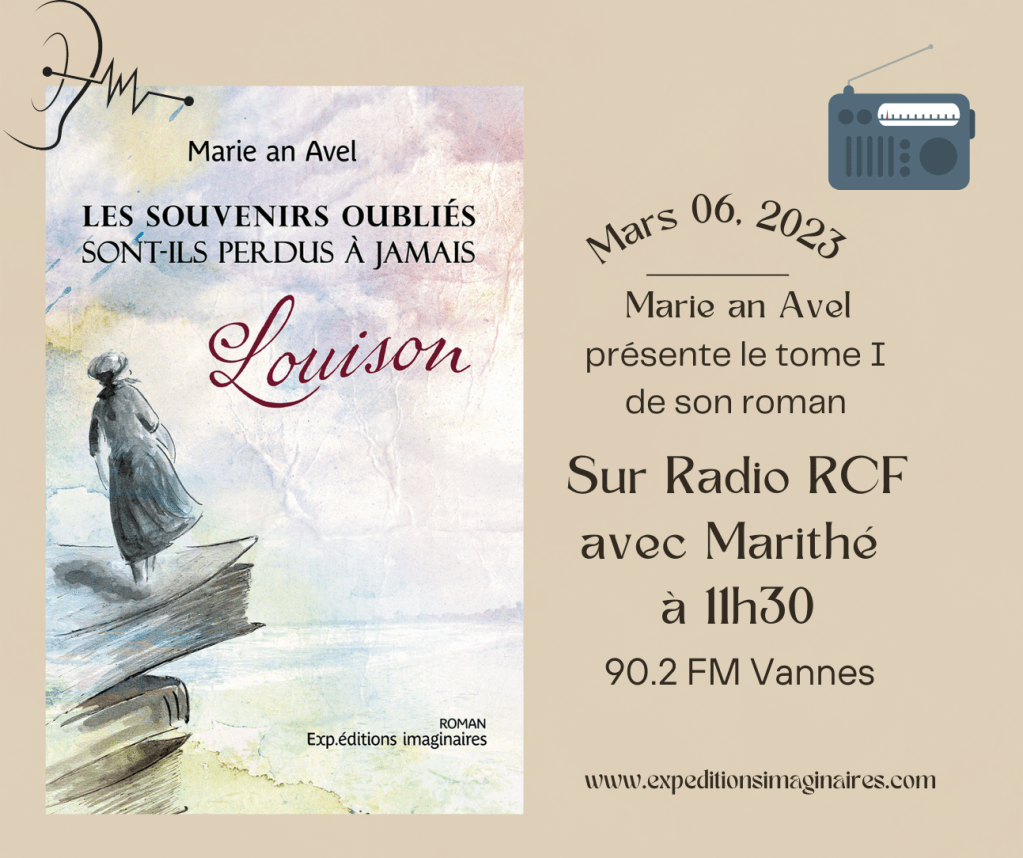 « Marie an Avel, autrice du Pays de Vannes, vit sur l’Île d’Arz ; elle est éditrice, autrice et maquettiste à Exp.éditions imaginaires. Elle écrit pour la jeunesse et publie ici son premier roman pour adultes, le tome 1 : « Louison – Les souvenirs oubliés sont-ils perdus à jamais ».