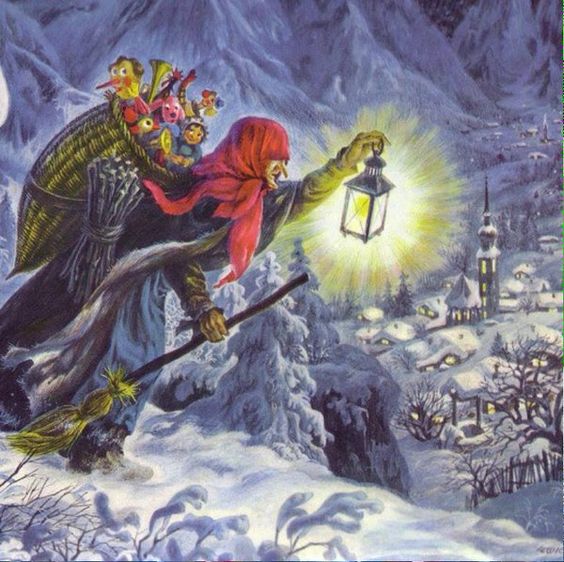 En Italie, de longues trompettes de verre annoncent l’arrivée de « La Befana » dans les ciels de Toscane. La Befana c’est la mère Noëlle de l’Italie du nord, elle apporte des cadeaux aux enfants la nuit de l’épiphanie. Elle est très attendue des « Bejanatas », les bandes de gamins déguisés, qui lui font la fête. À cheval sur un balai, un sac de charbon accroché à sa bosse, elle s’introduit dans les maisons et dépose des jouets aux enfants sages, de noirs escarbilles aux garnements. Le lendemain, il est coutume d’accrocher une poupée de chiffon à la fenêtre, partout où elle est passée… Et le soir, en cortège et mascarade, on va brûler sur la place l’effigie de la Befana afin qu’elle renaisse plus vaillante de ses cendres, l’année suivante…