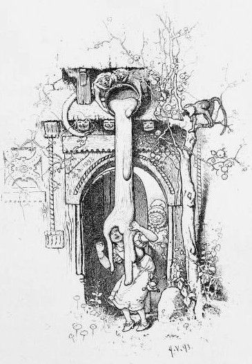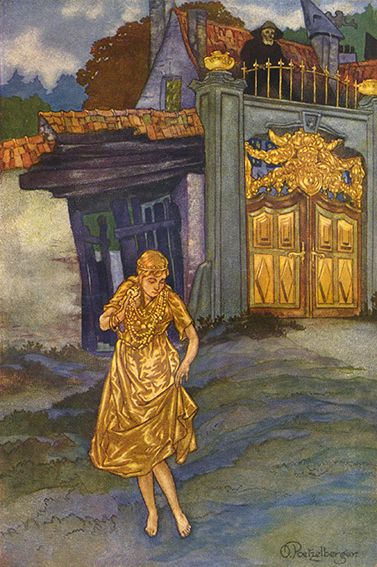 Elle saisit sa main et l’emmena devant un imposant portail, une porte majestueuse dont les battants étaient ouverts ; au moment où la jeune fille franchit le seuil, une pluie d’or tomba sur elle, dense et lumineuse, et tout l’or qui était tombé, resta sur elle, la recouvrant de la tête aux pieds, comme un long et majestueux manteau. « Voilà ce que je t’offre pour ton soin et ton application au travail » lui annonça Dame Hiver, en lui remettant également sa quenouille tombée au fond du puits.