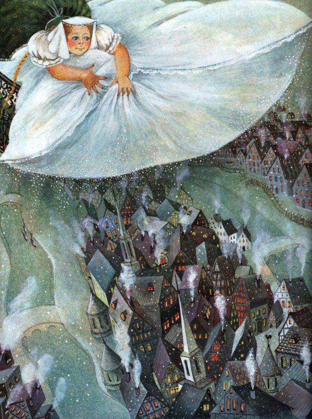 Rassurée par le ton bienveillant et les paroles rassurantes de la vieille, la jeune fille retrouva son courage, accepta son offre et entra à son service. Elle s’appliqua à sa tâche, à la grande satisfaction de Dame Hiver, battant et secouant son édredon jusqu’à faire voler les plumes de tous côtés, légères et dansantes comme des flocons de neige.