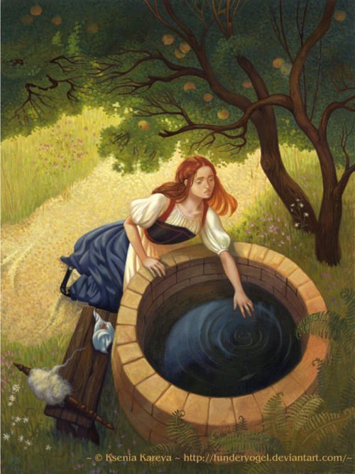 Chaque jour, elle devait s’asseoir près du puits sur la grand-route et filer jusqu’à avoir les doigts qui saignent. Un jour, alors que sa quenouille était poisseuse et tachée de sang, elle se pencha au-dessus du puits pour la nettoyer, mais elle lui échappa des mains et tomba au fond du puits. En larmes, elle alla rapporter son malheur à sa marâtre, qui la réprimanda durement. Sans pitié, elle lui ordonna : « Puisque tu as laissé tomber la quenouille, va la chercher ! » La pauvre fille retourna au puits, désespérée, et dans un élan de panique, sauta dans le puits pour récupérer la quenouille.