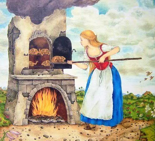 Elle perdit connaissance en tombant, et lorsqu’elle reprit ses esprits, elle découvrit une magnifique prairie, parsemée de milliers de fleurs, baignée par un soleil radieux. Elle traversa la prairie et arriva devant un four où l’on cuisait une fournée, et voilà que de l’intérieur les pains se mirent à crier :