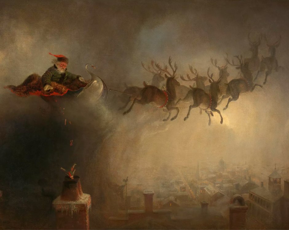 Peu après, j’entendis résonner sur le toit le piétinement fougueux de leurs petits sabots. Une fois la fenêtre refermée, je me retournai, juste au moment où le Père Noël sortait de la cheminée.