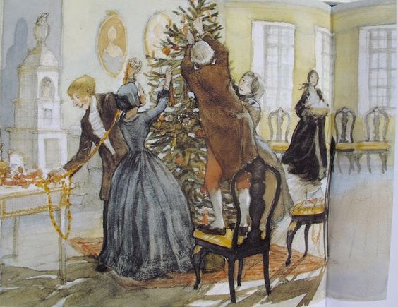 Alors, la porte s’ouvrit à deux battants, et une foule d’enfants se précipita sur le sapin, les grandes personnes les suivaient calmement. Les enfants s’arrêtèrent à peine une seconde avant de pousser des cris de joie – quel vacarme ! – ils se mirent à danser autour de l’arbre. Puis, on commença à ramasser les cadeaux un par un.