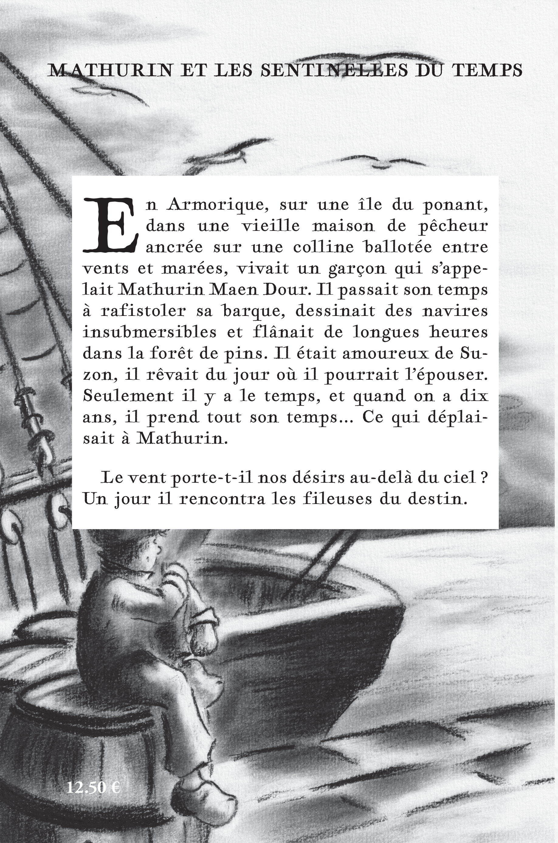 Résumé : En Armorique, sur une île du ponant, dans une vieille maison de pêcheur ancrée sur une colline ballotée entre vents et marées, vivait un garçon qui s’appelait Mathurin Maen Dour. Il passait son temps à rafistoler sa barque, dessinait des navires insubmersibles et flânait de longues heures dans la forêt de pins. Il était amoureux de Suzon et rêvait du jour où il pourrait l’épouser. Seulement il y a le temps, et quand on a dix ans, il prend tout son temps. Ce qui déplaisait à Mathurin.